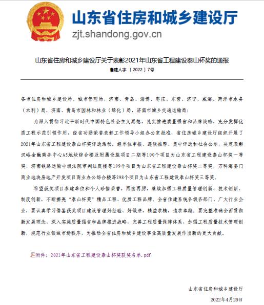 公司兩項工程榮獲2021年度“山東省工程建設泰山杯獎”