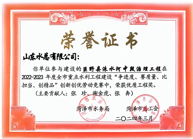 近日,菏澤市水務(wù)局、菏澤市總工會公布了“2022-2023年度全市重點(diǎn)水利工程建設(shè)“爭進(jìn)度、賽質(zhì)量、比擔(dān)當(dāng)、創(chuàng)精品”創(chuàng)新創(chuàng)優(yōu)勞動競賽”獲獎(jiǎng)名單,公司及權(quán)屬單位二局有限公司共榮獲優(yōu)質(zhì)工程1項(xiàng)、文明工地2項(xiàng)、QC成果1項(xiàng),優(yōu)秀項(xiàng)目經(jīng)理1項(xiàng)。