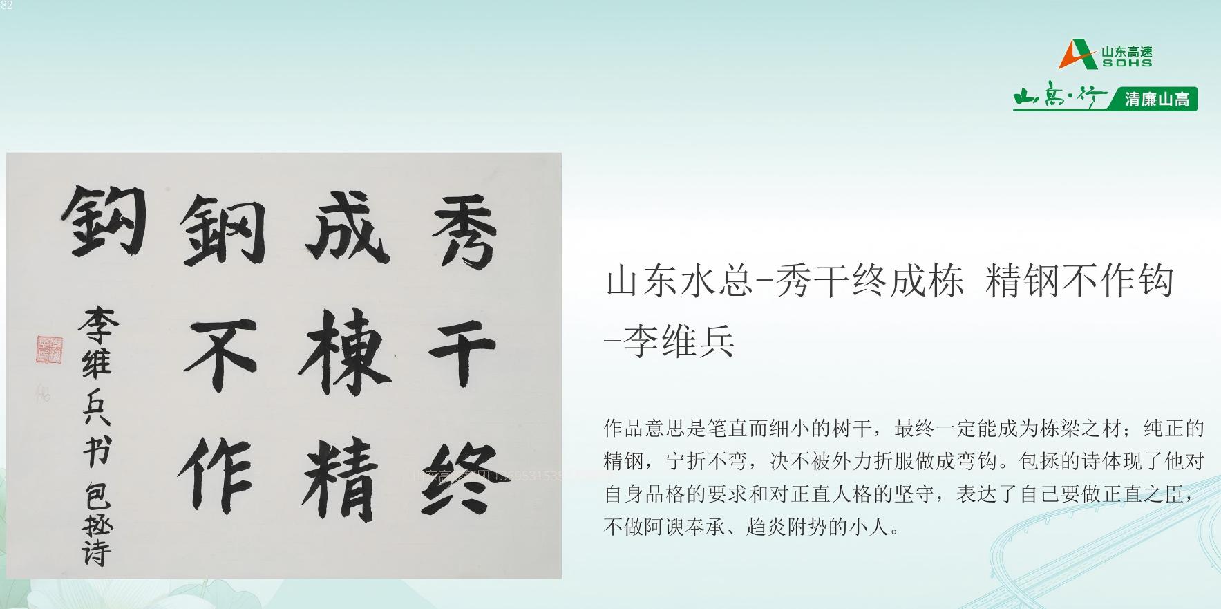 6月11日,在山東高速集團(tuán)紀(jì)委組織的“清廉山高”廉潔文化作品征集活動中,山東水總基礎(chǔ)工程有限公司制作的短視頻《筑廉潔防線,守初心之路》榮獲“光影映廉”板塊三等獎,第二分公司李維兵的書法作品《秀干終成棟,精鋼不作鉤》摘得“工藝創(chuàng)廉”書法類優(yōu)秀獎。