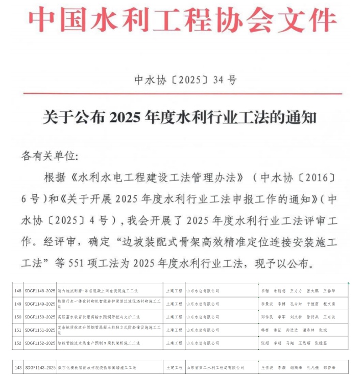 公司斬獲6項(xiàng)2025年度水利行業(yè)工法