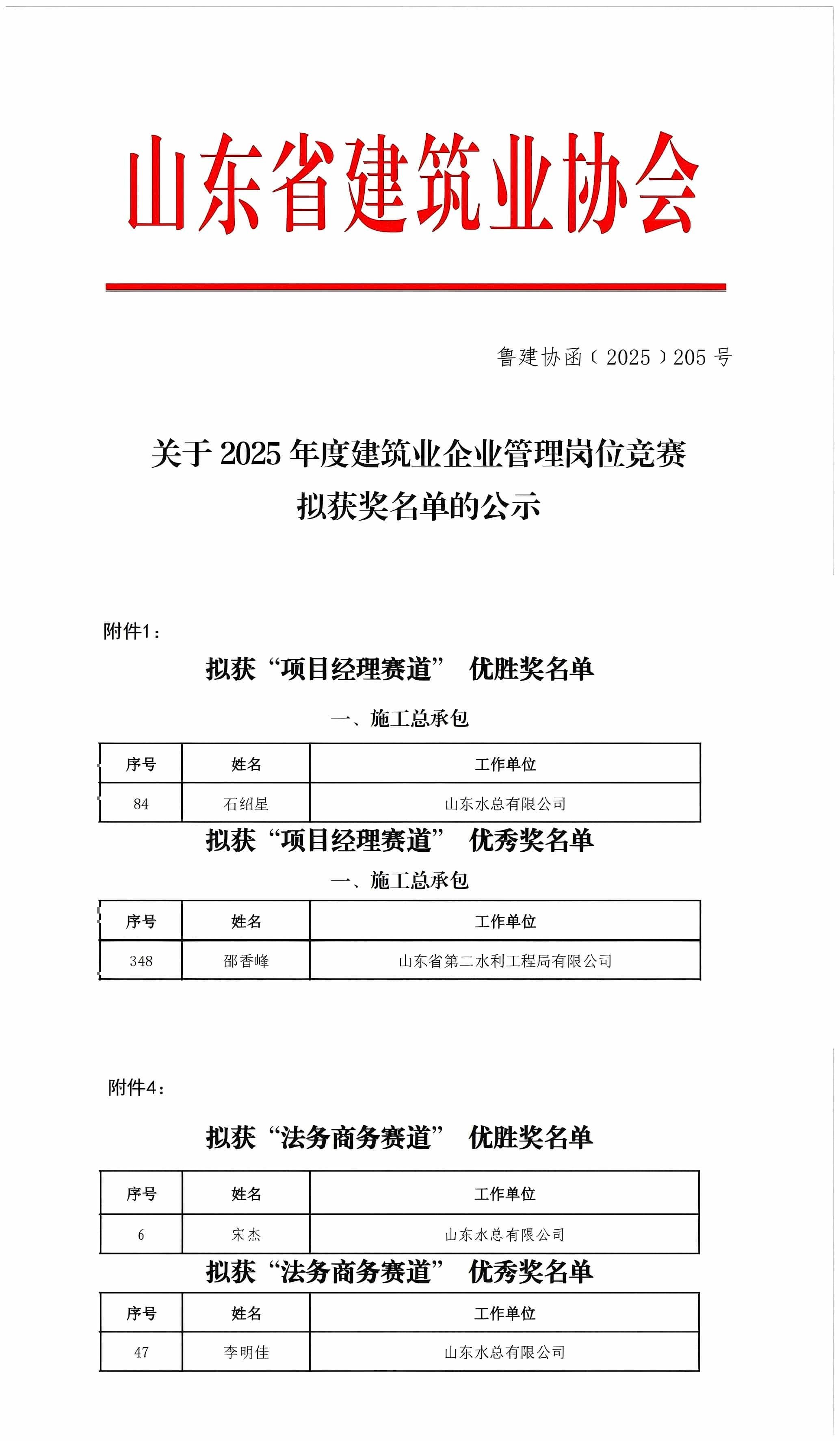 近日,由山東省建筑業(yè)協(xié)會發(fā)起的2025年度建筑業(yè)企業(yè)管理崗位競賽圓滿落幕,公司選送的參賽人員憑借扎實(shí)的專業(yè)素養(yǎng)、精湛的管理能力脫穎而出,在“項(xiàng)目經(jīng)理賽道”中,第三分公司石紹星獲優(yōu)勝獎,二局有限公司邵香峰獲優(yōu)秀獎;在“法務(wù)商務(wù)賽道”中,企業(yè)管理部宋杰獲優(yōu)勝獎,第三分公司李明佳獲優(yōu)秀獎。以上榮譽(yù)的獲得充分彰顯了公司建筑行業(yè)管理崗位人才的專業(yè)素養(yǎng)與創(chuàng)新活力。