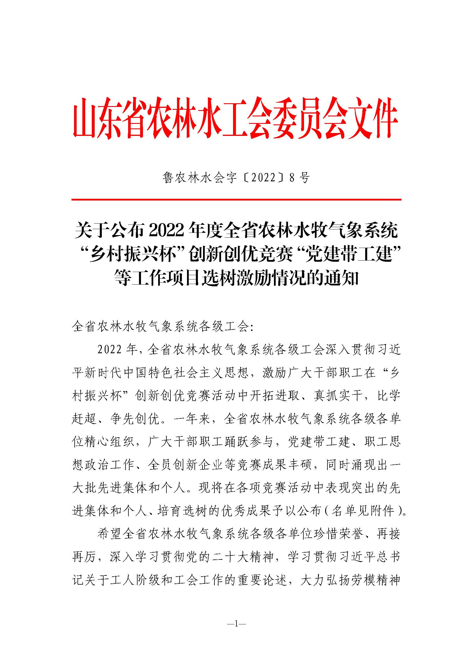 近日,山東省農(nóng)林水工會委員會下發(fā)《關(guān)于公布2022年度全省農(nóng)林水牧氣象系統(tǒng)“鄉(xiāng)村振興杯”創(chuàng)新創(chuàng)優(yōu)競賽等工作項目選樹激勵情況的通知》,對涌現(xiàn)出的先進集體、個人和優(yōu)秀案例予以通報表揚。第六分公司報送的《以“黨建+”系列活動為抓手 實施“黨建帶工建項目化”管理》和基礎(chǔ)公司報送的《黨建帶工建 攜手共建》兩個案例榮獲“黨建帶工建、工建促黨建”優(yōu)秀案例;第二分公司報送的《堅持以人為本 結(jié)合實際開展職工思想政治工作》榮獲“職工思想政治工作”優(yōu)秀案例;劉永恩同志榮獲第二屆“身邊的愛崗敬業(yè)榜樣”;蘇強、謝金虎、李云賀同志榮獲“職工安全隱患排查競賽優(yōu)秀個人”。