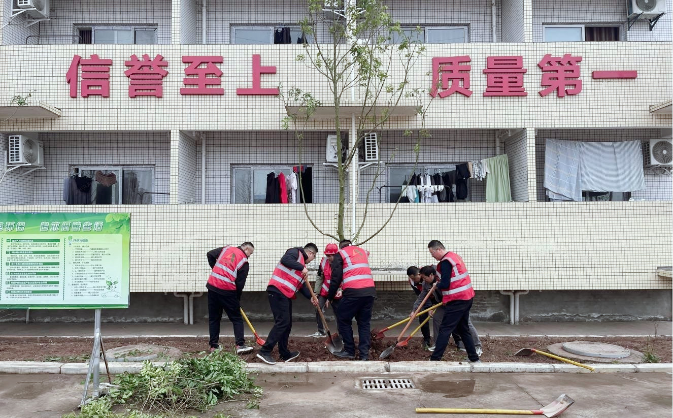 活動(dòng)現(xiàn)場,項(xiàng)目部黨員充分發(fā)揮先鋒模范作用,身先士卒搬運(yùn)樹苗,團(tuán)員青年們也個(gè)個(gè)熱情高漲、干勁十足。大家分工明確,互相協(xié)作,一挖一鏟,一揮一種,精心栽培,用心澆灌,踐行了“綠水青山就是金山銀山”的理念,美化了項(xiàng)目駐地,營造了綠色舒適的工作生活環(huán)境,展現(xiàn)了企業(yè)良好形象。