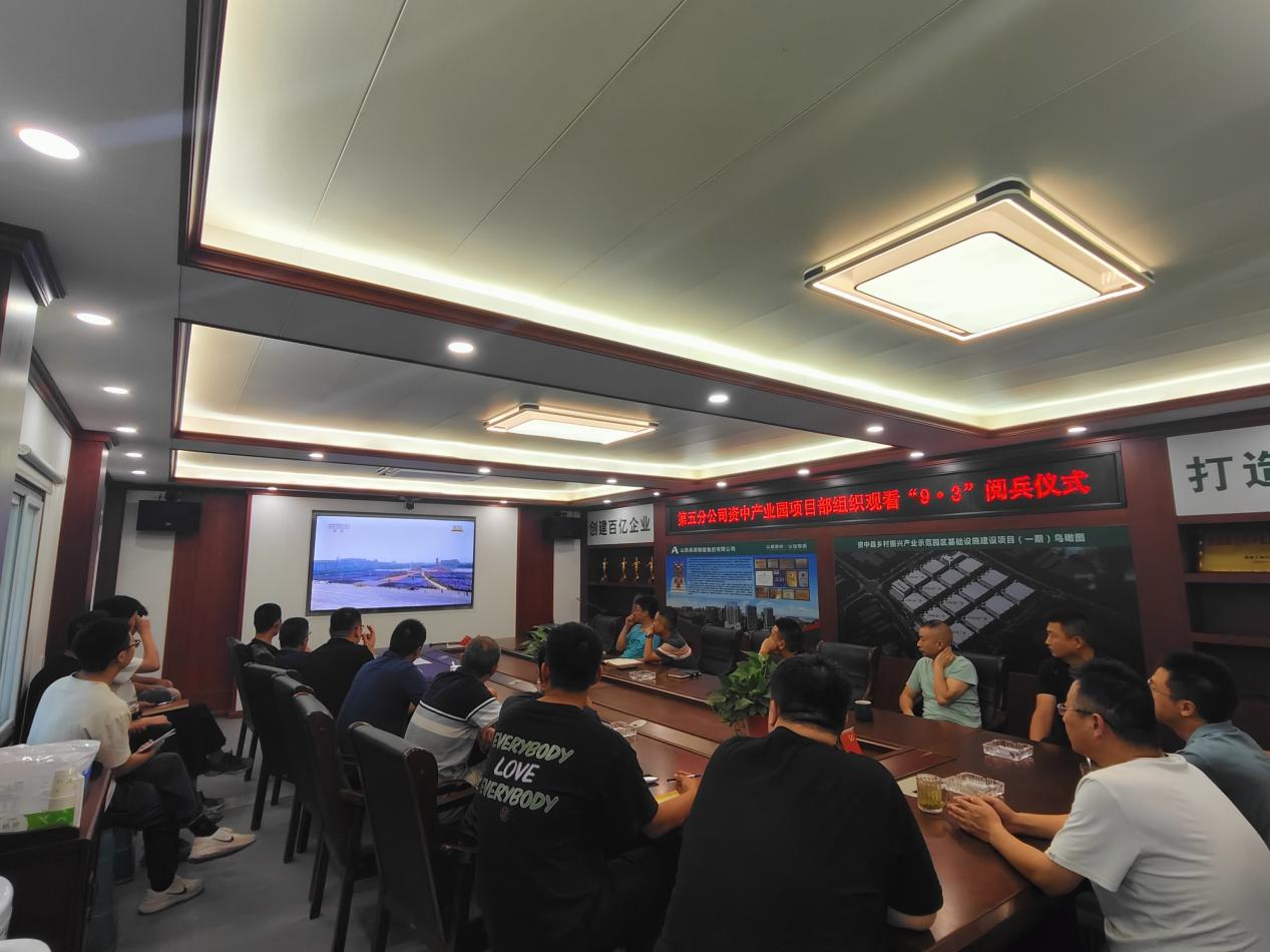 為弘揚愛國主義精神,厚植家國情懷,銘記歷史征程,9月3日,第五分公司資中縣產業(yè)園項目部組織全體員工在會議室集中觀看紀念中國人民抗日戰(zhàn)爭暨世界反法西斯戰(zhàn)爭勝利八十周年閱兵儀式現(xiàn)場直播。
